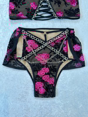 This is Kenzo set. This gorgeous set is made of beautiful and high quality floral burnout velvet fabric. The top is completely adjustable at the back. The set is stretchy and really comfortable. The bottoms come with their details. It suits all body type and comes in 5 sizes.